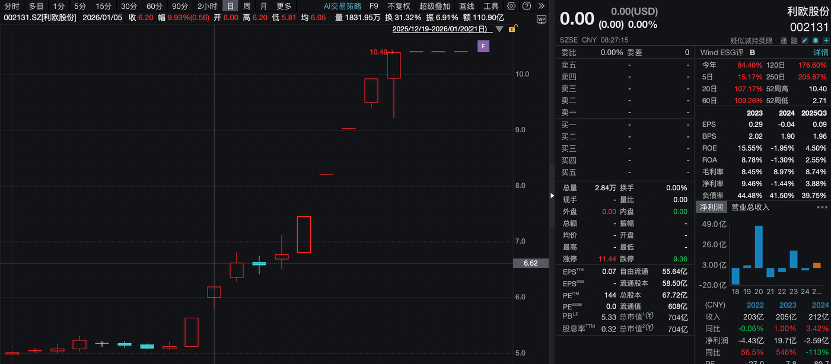 1月20日晚,利欧股份(002131)公告称,公司股票将于2026年1月21日(星期三)开市起复牌。此前,公司股票连续10个交易日收盘价涨幅偏离值达96.77%,股价波动较大,公司申请停牌核查。