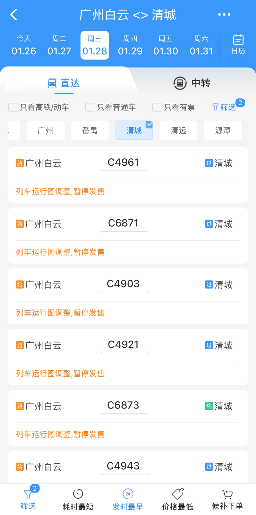 花都站到广州白云站的广清城际南延段,最快有望在28日通车。今天(26日),铁路12306系统更新信息,从28日起加入该段线路的多个车次。
