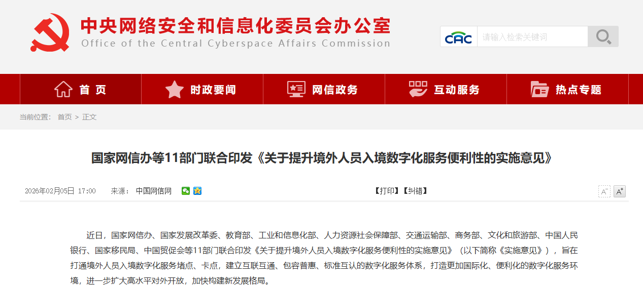 近日,国家网信办、国家发展改革委、教育部、工业和信息化部、人力资源社会保障部、交通运输部、商务部、文化和旅游部、中国人民银行、国家移民局、中国贸促会等11部门联合印发《关于提升境外人员入境数字化服务便利性的实施意见》(以下简称《实施意见》),旨在打通境外人员入境数字化服务堵点、卡点,建立互联互通、包容普惠、标准互认的数字化服务体系,打造更加国际化、便利化的数字化服务环境,进一步扩大高水平对外开放,加快构建新发展格局。