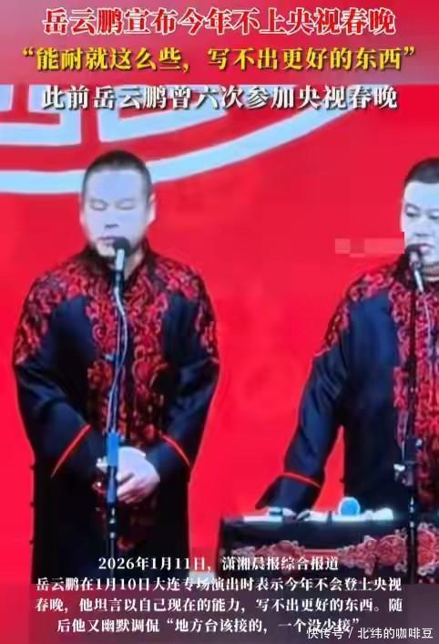曾经8次登上春晚舞台的岳云鹏,现在却已经失去了广大观众的喜欢。 在距离春晚仅仅剩下一个多月左右时,有关于他疑似会退出2026年春晚的消息,登上了热搜? 当这个消息传出来后,几乎没有人感到惋惜,反而觉得终于可以不用在舞台上看见他了。 事情的真相究竟是怎样?难道他也明白自己必须要沉淀沉淀一番了吗? 作为德云社现在的台柱子,岳云鹏所做出来的很多事情,现在都让观众觉得不务正业。 明明知道现在相声的发展并不吃香,可他并没有想过去带动这一领域的发展。 而是把重心放在了开演唱会和影视剧这方面,他的这种所作所为,自然会引起郭德纲的不满。 毕竟当时的郭德纲愿意对他进行帮助,也是看到了他在相声这方面的天赋,希望他的出现能够把相声带到一个新的高度。 刚开始的岳云鹏确实没有让他失望,他的优秀表现不仅让他自身提高了名气,同时也让德云社的热度开始暴涨。 直到这时候大家才终于明白,为什么当初的郭德纲想尽一切方式都要把他留下来。 他的这种优秀表现也让他很快就得到了央视春晚的重视。 当这个好消息传出来时,岳云鹏也感到欣喜若狂,在春晚舞台上自然把最好的表现呈现了出来。 尤其是2014年,他所推出的小品《扰民了您》,那真的是让底下的观众捧腹大笑。 看到他第一次出现在舞台上,就打造出了这样的高光作品,央视也知道自己这次并没有喊错人。 接下来连续好几年的时间,他的身影都出现在了春晚的舞台上。 本以为他会一直创造过去的辉煌,可后来他的表现却让人觉得愈发不尽人意。 先是打小抄,接下来又各种笑场。 当他的态度变得越来越敷衍后,很多曾经喜欢他的观众都改变了过去对他的支持,直接在他的面前贴脸开大。 比如去年的春晚,他特意采访了底下的一个观众,看看他对自己有没有什么建议? 而这个观众或许是对岳云鹏的表现很是不满,直接就没有给他任何面子的说道: 当他在观众心中的形象彻底走下坡路后,大家也希望他能及时调整, 可他却并没有放在心上,反而跑去开演唱会了。 他的这种行为只会让人觉得他的野心愈发膨胀了起来, 当他的重心发生改变之后,他的专业能力又怎么可能不下滑? 现在还有不少人针对他身上所出现的这种情况,直接就去联系郭德纲了。 觉得这些年他对徒弟的管教实在是太过于松懈了。 看到师傅因为自己身上所发生的事情受到影响后,岳云鹏也曾站出来回应过这个话题。 他表示不是他不想努力,而是他压力真的很大,毕竟需要出现在全国观众都关注的舞台上。 只不过对于他的这种说法,观众并不认可,毕竟曾经他的表现和现在可以说天差地别。